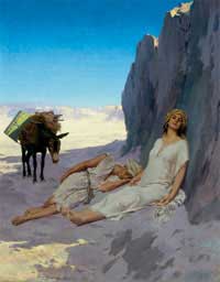 | Under the Shadow of a Great Rock Behold, a king shall reign in righteousness, and princes shall rule in judgment. And a man shall be as an hiding place from the wind, and a covert from the tempest; as rivers of water in a dry place as the shadow of a great rock in a weary land. The last painting by Taylor published by Curtis Publishing Company.